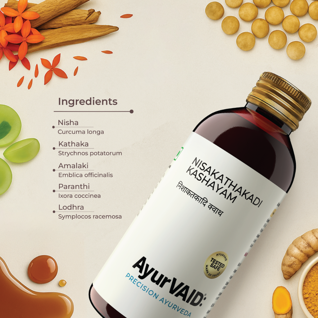 - AyurVAID Nisakathakadi Kashayam is a classical Ayurveda formulation traditionally used to support healthy blood sugar levels and promote balanced metabolism. Infused with Turmeric, Amla, and Triphala, this Kashayam may help regulate high blood sugar experiences and symptoms like frequent urination or fatigue, swelling of the feet, and burning or tingling. As part of India’s first & only TESTED SAFE Ayurveda range, this Kashayam is carefully formulated to meet stringent safety standards for Heavy Metals, Aflatoxins, and Microbial Load, ensuring purity, safety, and therapeutic integrity.