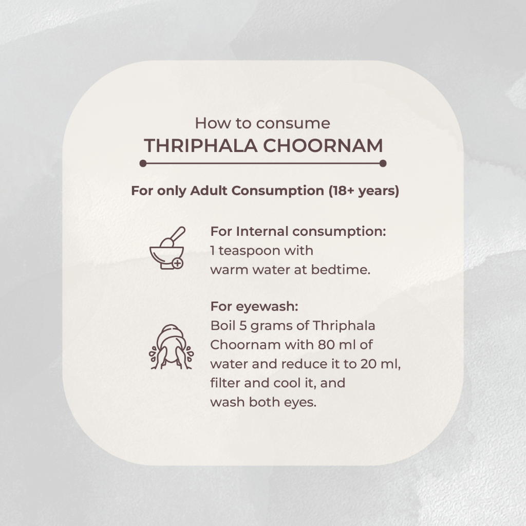 - AyurVAID Triphala Choornam is a classical, time-tested Ayurveda formulation made from the three potent fruits: Amla, Vibhitaki, and Haritaki. Renowned for its mild detoxifying qualities, this choornam promotes healthy digestion, regularity of bowel movements, and internal cleansing without dependence. Typically taken daily to support gut health, this remedy promotes digestive balance, natural detoxification, and overall gut health over the long term. Besides promoting healthy digestion, Thriphala Choornam benefits include eye health, skin clarity, and overall vitality when taken internally or as a gentle eyewash under the supervision of an Ayurveda practitioner.