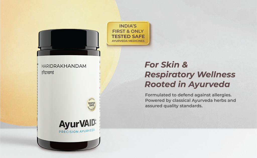 AyurVAID Haridrakhandam is a classical Ayurveda formulation crafted for relief from skin and respiratory allergies. Powered by Amla, Turmeric, and Ginger, it naturally supports immunity, reduces seasonal triggers, and promotes overall vitality. It is traditionally used in the treatment of Dadru Nashana (fungal skin infections), and it is used in the reduction of itching, rashes, sneezing, and congestion with a complete anti-allergy treatment. It is mild, non-drowsy, and non-habit forming and can be used long-term without any side effects in all age groups. As part of India’s first & only TESTED SAFE Ayurveda range, Haridrakhandam is manufactured to the highest standards, ensuring purity, safety, and therapeutic integrity.