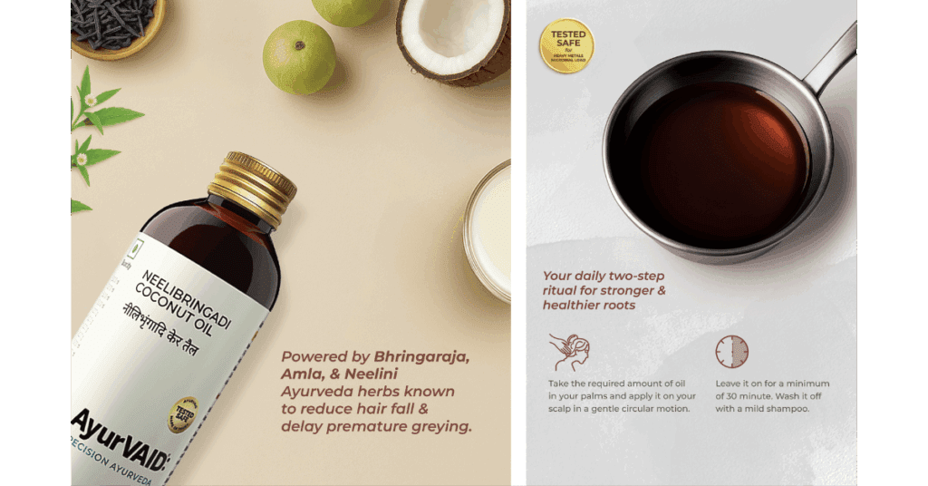 - Ayurvedic Hair Oil for Hair Fall: While internal support strengthens hair from within, external care is equally important. AyurVAID Neelibringadi Coconut Oil is widely regarded as one of the best Ayurvedic hair oils for hair fall, especially in Pitta-dominant hair disorders.