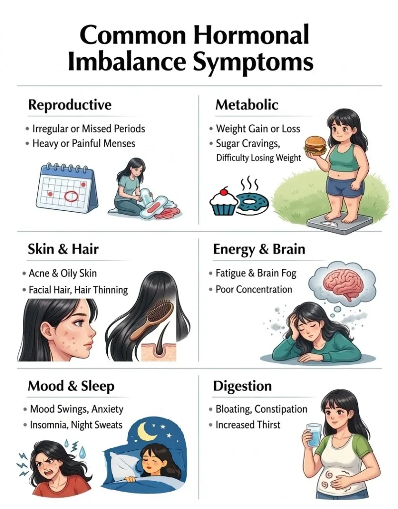 Common hormonal imbalance symptoms include irregular menstrual cycles, unexplained weight gain, and persistent fatigue or mood swings. You might also notice physical changes like acne, thinning hair, or sudden hot flashes.