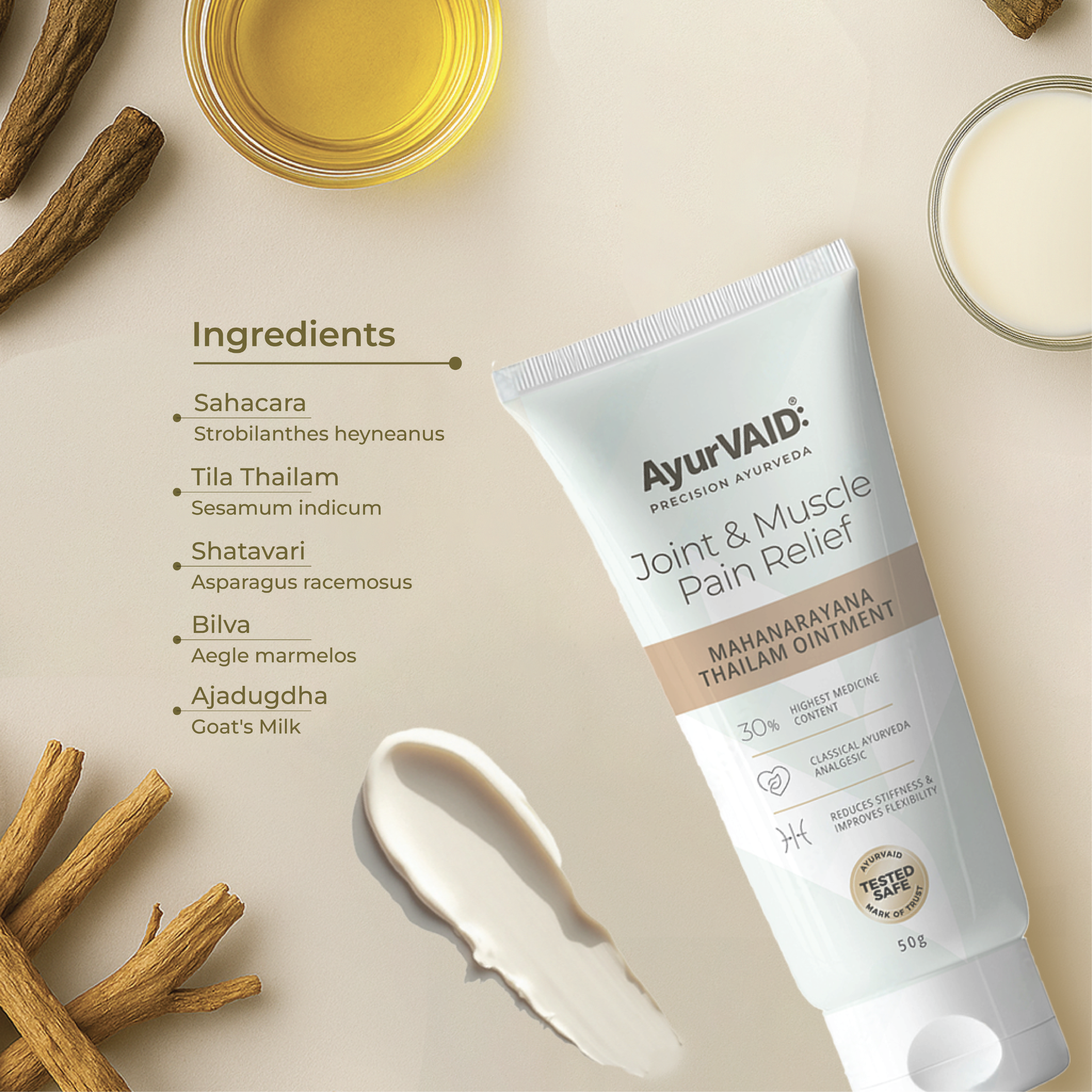 AyurVAID’s Mahanarayana Thailam Ointment has 30% medicinal content, making it one of the most potent formulations. Most commercial creams dilute the medicinal oil content. AyurVAID does the opposite. This ointment contains 30% pure Mahanarayana Thailam — one of the highest concentrated compositions you will find. That means: