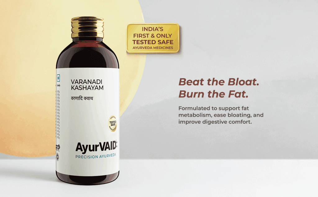 • AyurVAID Varanadi Kashayam Varanadi Kashayam helps the body absorb nutrients, supports a healthy weight, and reduces bloating, especially during the menstrual cycle and pregnancy. It can also reduce discomfort in a minor headache, improve healing following mild inflammation, and is a versatile medicine for managing women’s health challenges.