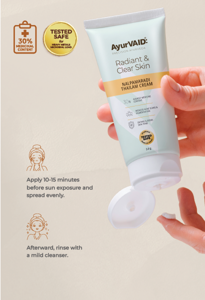 AyurVAID Nalpamaradi Thailam Cream is useful for those who struggle with tanning, uneven skin tone, sunburn, or dullness. Unlike greasy oils, this modern adaptation is a light, fast-absorbing cream blending turmeric, nalpamara (four ficus trees), sandalwood, and sesame oil. It helps reduce skin rashes and provides a noticeable reduction in skin inflammation and giving a natural, luminous glow over time.