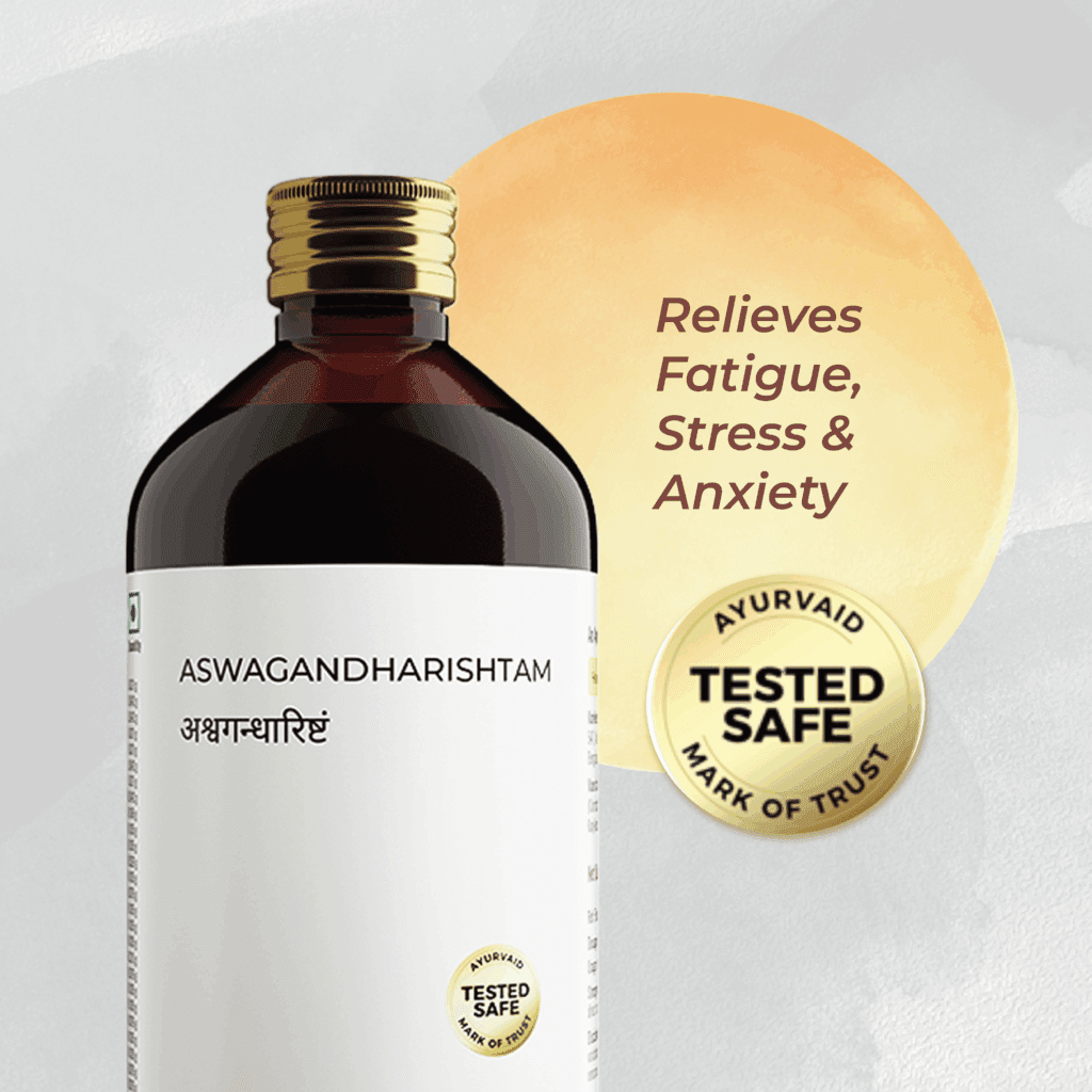 • AyurVAID Aswagandharishtam – Infused with Ashwagandha, Chandan, and Honey, this calming formulation promotes mental clarity and stress relief. It is beneficial for improving sleep and stamina when the mind feels overworked or restless. Backed by rigorous safety testing, this product is certified safe by NABL-accredited laboratories, assuring purity from heavy metals, toxins, and microbes. The results are accessible via the QR code on the package.