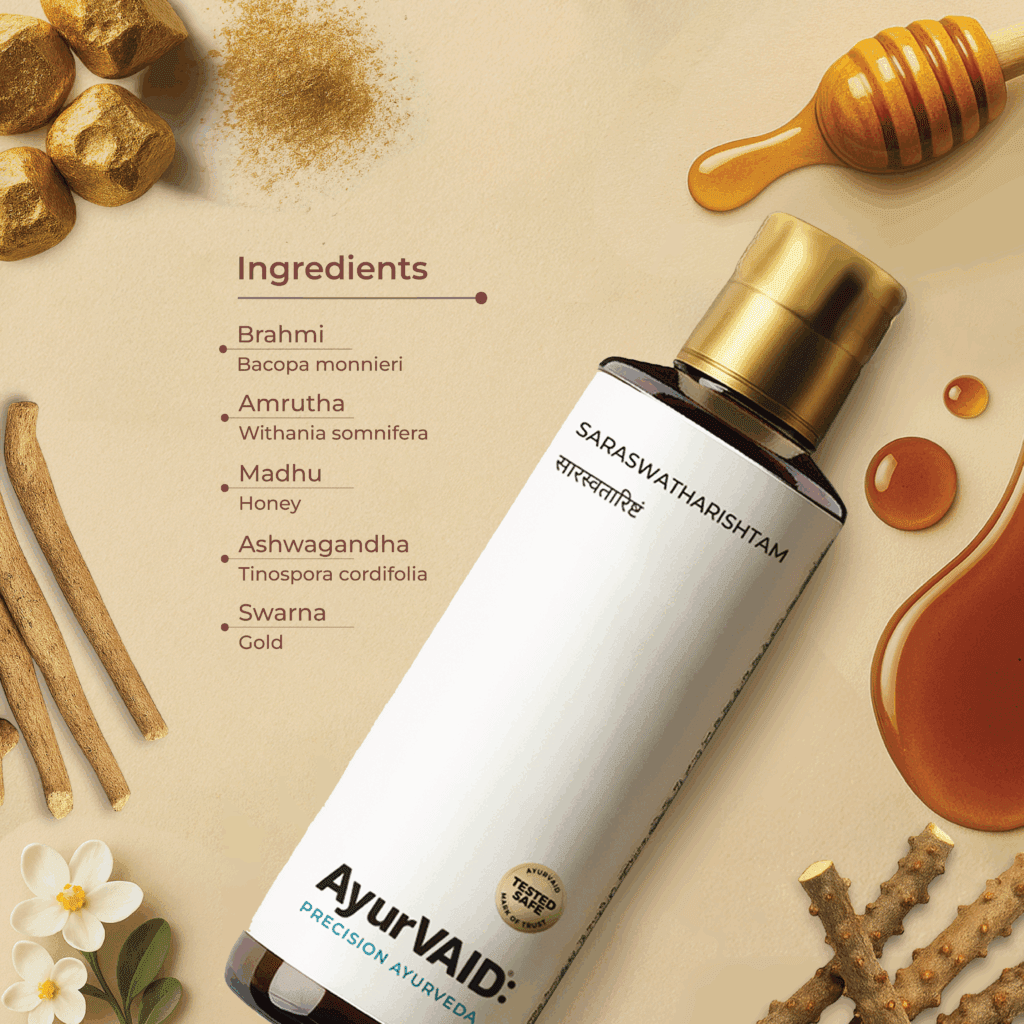 • AyurVAID Saraswatharishtam with Gold – A traditional formulation with Brahmi, Ashwagandha, and Swarna Bhasma (gold), Saraswatharishtam promotes normal brain performance, enhances memory, and promotes mental clarity. It reduces anxiety and stimulates restful sleep while relieving mental exhaustion and fatigue. It is recommended for individuals experiencing heavy workloads or managing emotional stress. Every formulation is deemed safe by NABL-accredited laboratories and has been tested for heavy metals, aflatoxins, and microbes – puttng the formulation at the highest benchmark for safety. Consumers can verify test results for each specific product via a QR code located on the label.
