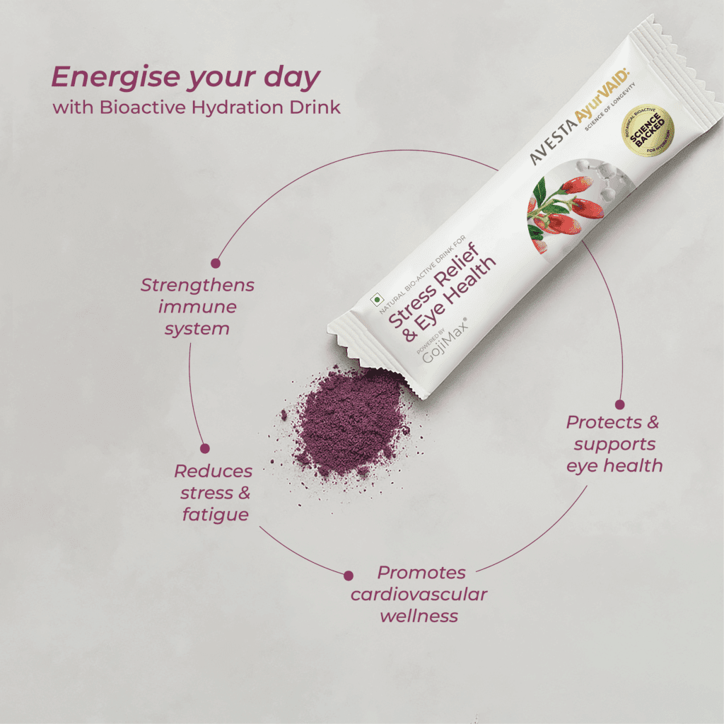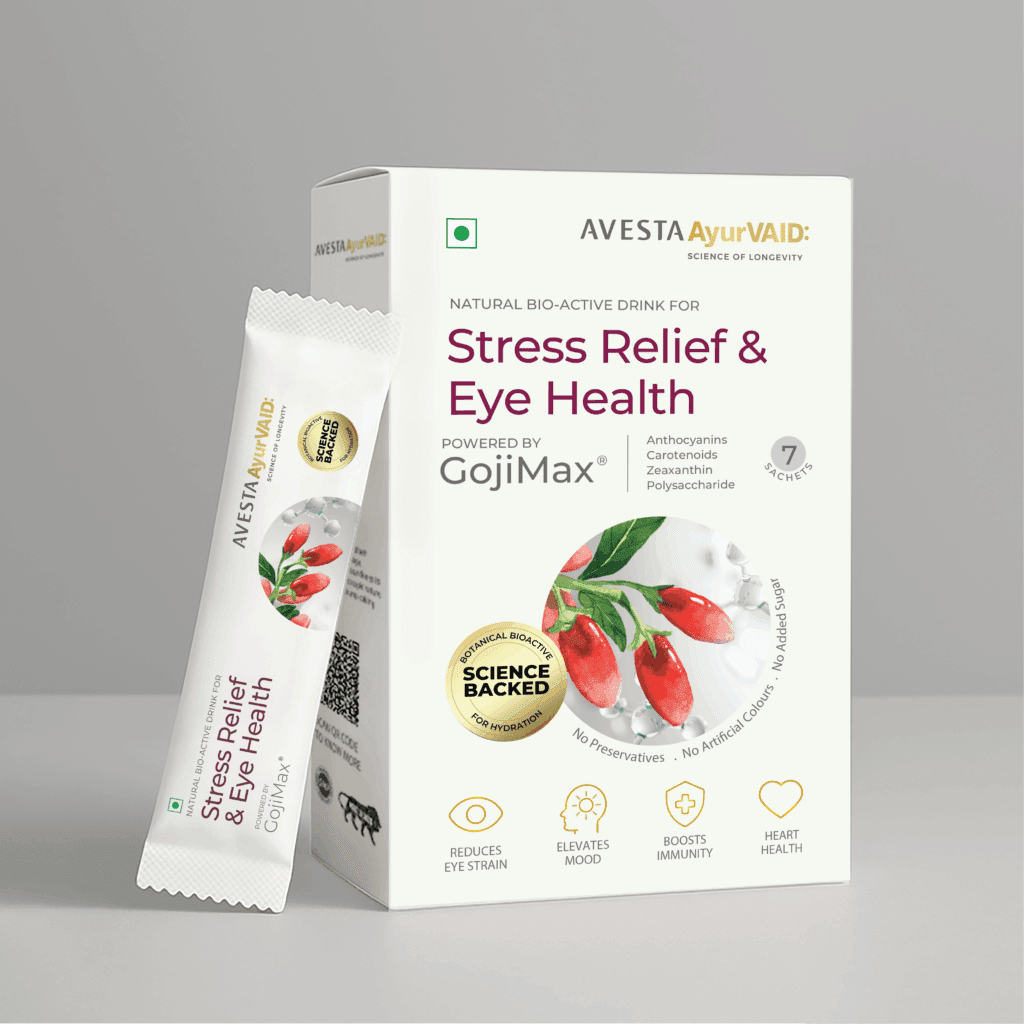 • AvestaAyurVAID Stress Relief & Eye Health Drink – A science-backed, bioactive hydration drink made with goji berry extract that is natural, GMP-compliant, trusted, and effective. It is an effective solution for those experiencing chronic stress, eye strain, fatigue, or the physical effects of prolonged screen use. Nutrients like beta-carotene and zeaxanthin help protect the eyes and overall well-being, and the formula contains no added sugar, preservatives, or artificial colours.